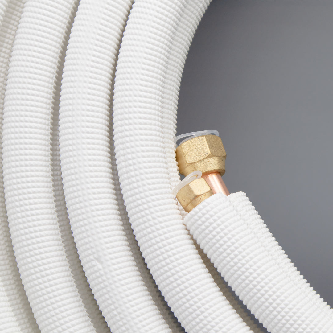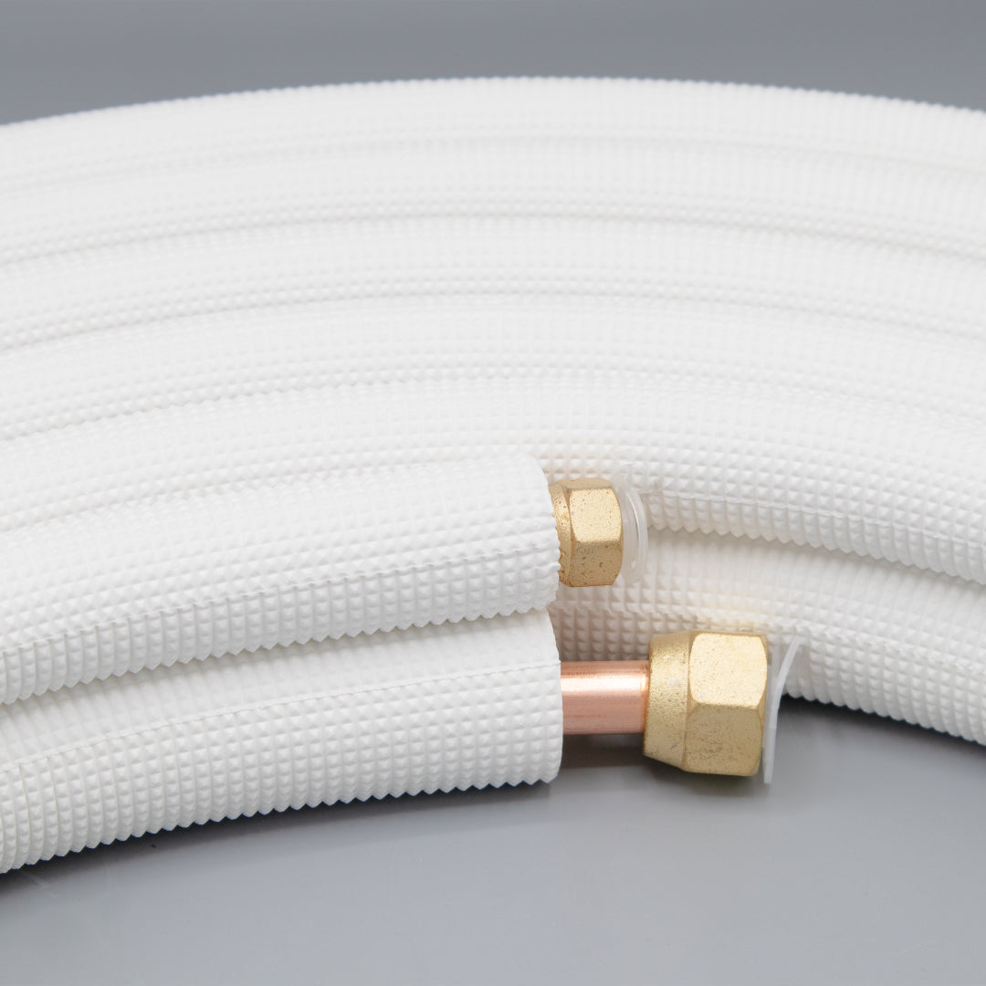 HVAC copper line set with 1/4" liquid and 5/8" suction lines, pre-insulated with Type B twin tube insulation. Designed for mini split and central A/C systems, this 25′ line set ensures efficient refrigerant flow, reduced condensation, and long-lasting durability.